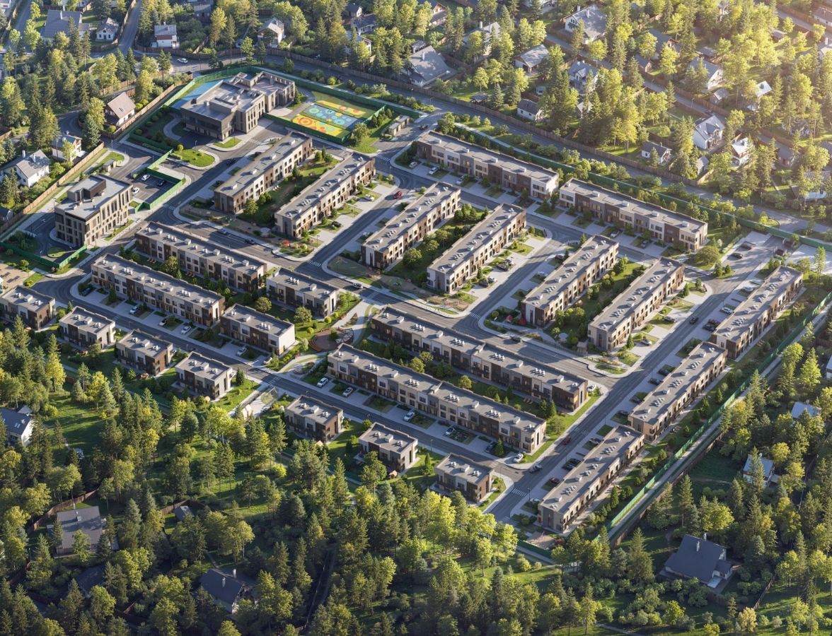 Таунхаусы расположены в селе Троицкое, между лесом и водохранилищем. Камерная историческая среда, природное окружение и низкая плотность застройки формируют спокойный ритм жизни.